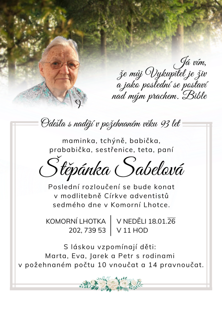Poslední rozloučení se bude konat v neděli 18. ledna 2026 v 11 hodin v modlitebně Církve adventistů sedmého dne v Komorní Lhotce – Komorní Lhotka 202, 739 53.