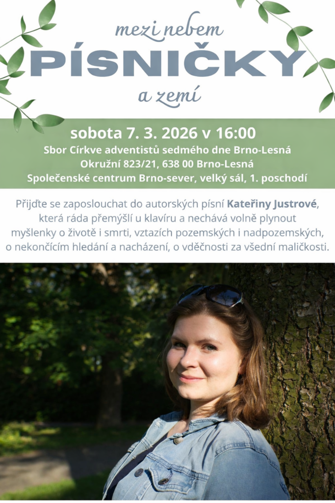 6 Úno PÍSNIČKYMEZI NEBEM A ZEMÍ Přijměte pozvánku na sobotu 7. března 2026 do sboru CASD Brno-Lesná, kde od 16 hodin zazní autorské písně Kateřiny Justrové. Sbor CASD Brno-Lesná Tags: Sbor / všichni
