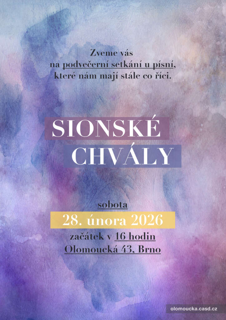 5 Úno Zveme vás na podvečerní setkání u písní, které nám mají stále co říci. Sobota 28. února 2026 / 16 hodinSbor CASD Brno – Olomoucká / Olomoucká 43, Brno Tags: Sbor / všichni